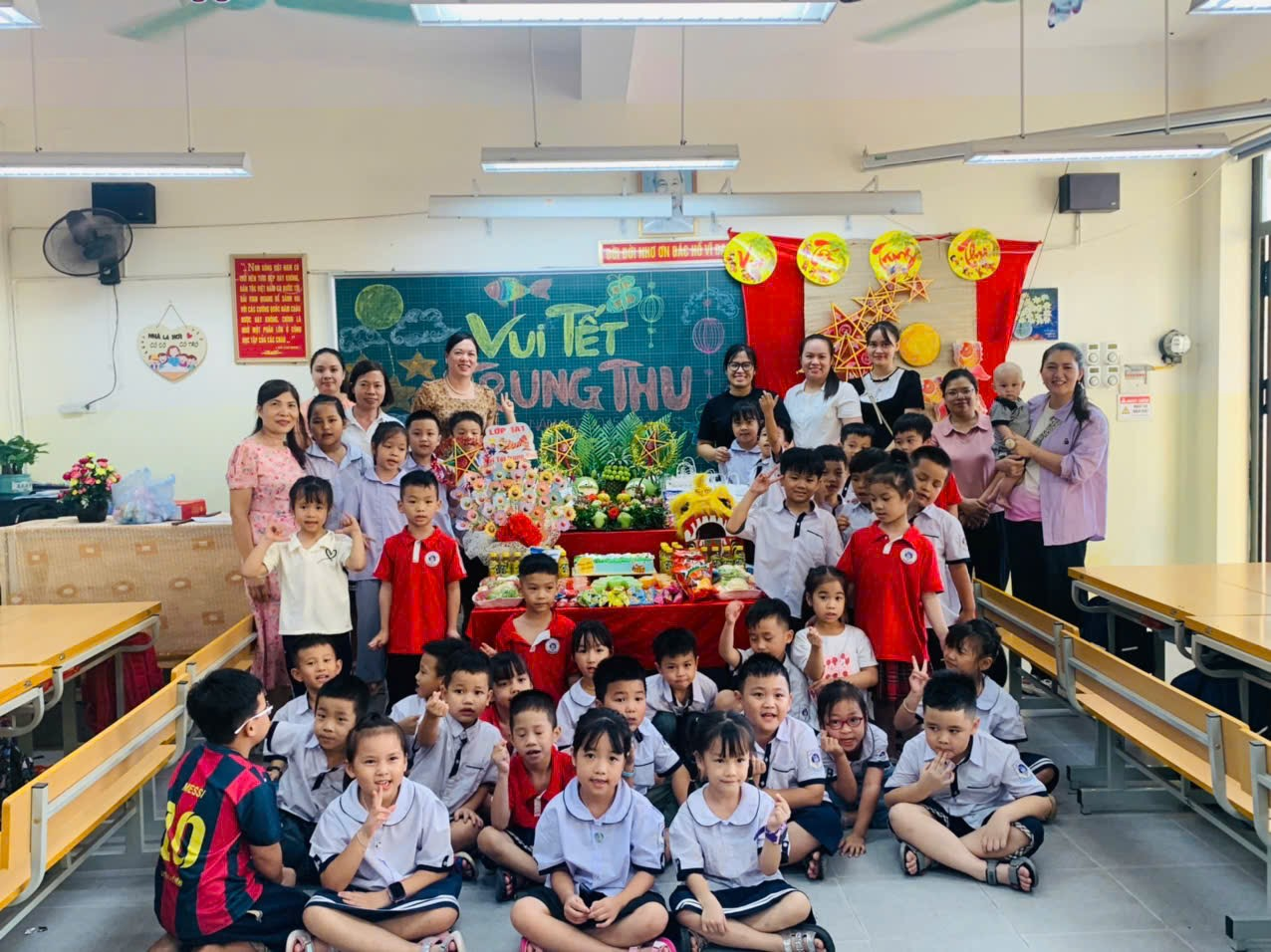 Tại các lớp, niềm vui, niềm hân hoan hiện rõ trên khuôn mặt trẻ thơ. Các em háo hức khi được tự tay cùng cô giáo và cha mẹ bày mâm cỗ Trung thu, các em tự tay cắt tỉa các loại quả thành hình các con vật trông thật ngộ nghĩnh. Sự quan tâm, chăm lo các bậc phụ huynh và các thầy cô giáo đã mang đến cho các em một cái Tết Trung thu vẹn tròn, ý nghĩa, để các em viết tiếp những dòng kỷ niệm tươi đẹp đong đầy ký ức một thời tuổi thơ.
