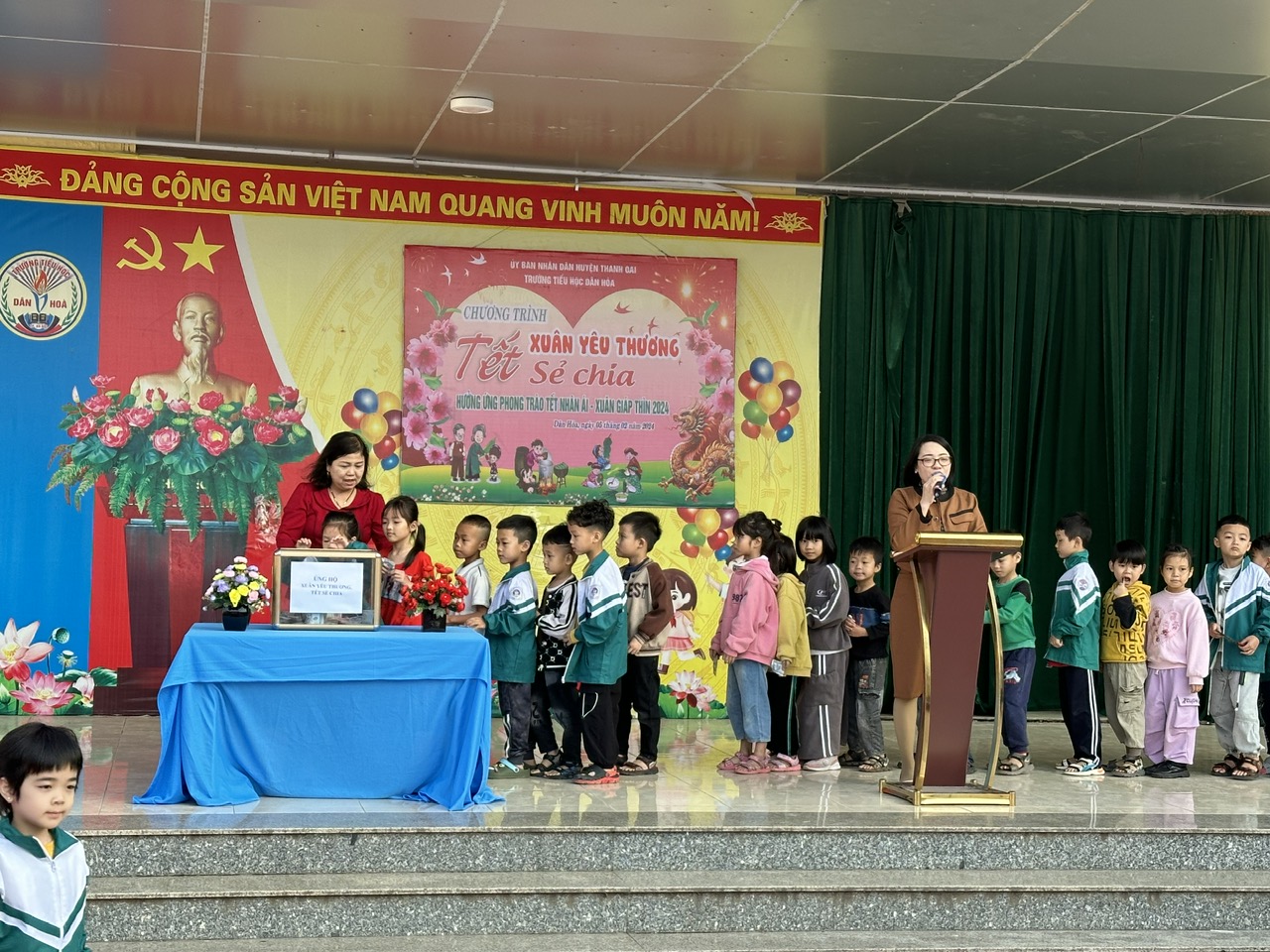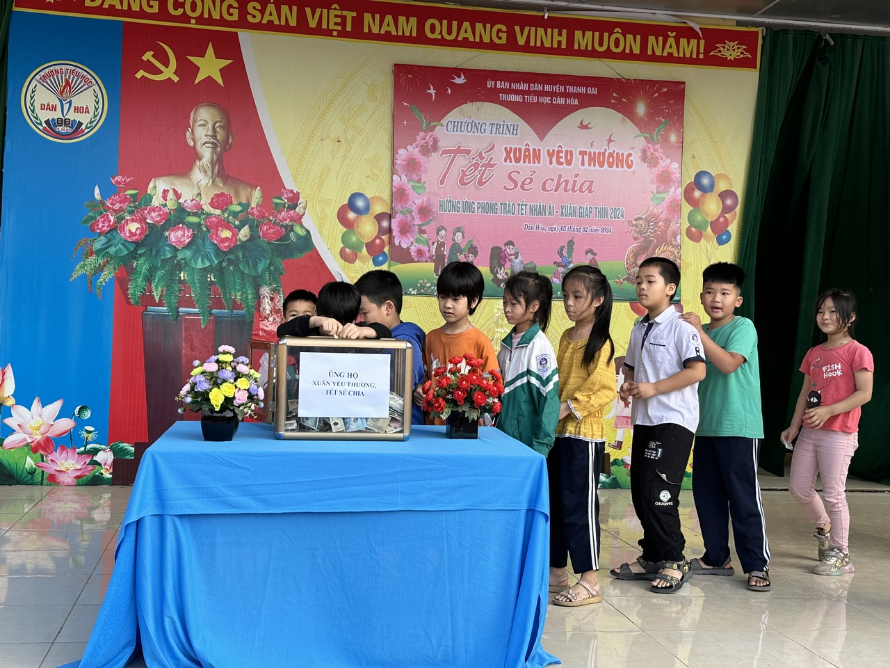 Nhằm động viên, khích lệ những học sinh nghèo có hoàn cảnh đặc biệt khó khăn vươn lên trong học tập. Buổi sáng ngày hôm nay, trường Tiểu học Dân Hòalong trọng tổ chức chương trình: “Xuân yêu thương – Tết chia sẻ”; “Hưởng ứng phong trào tết nhân ái – Xuân Giáp Thìn 2024”. Đến dự với chương trình ngày hôm nay có các vị đại biểu khách quý. Cô giáo: Nguyễn Thị Hồng Thắm – Bí thư Chi Bộ, Hiệu trưởng nhà trường. Cô giáo: Nguyễn Thị Hải – Phó Bí thư Chi Bộ, Phó Hiệu trưởng nhà trường. Cô giáo: Nguyễn Thị Lan – Phó hiệu trưởng nhà trường cùng toàn thể các đồng chí CBGV – NV và 928 các bạn học sinh đã có mặt đông đủ. Với tấm lòng nhân ái, Chúng ta hãy biết yêu thương, lá lành đùm lá rách, một miếng khi đói bằng một gói khi no. Đó là truyền thống, đạo lý, là nghĩa cử cao đẹp của dân tộc ta từ xưa đến nay. Nhân dịp Tết đến xuân về, xuân Giáp Thìn đang cận kề, nhà trường kêu gọi sự ủng hộ của các thầy cô giáo, các em học sinh trong toàn liên đội. Các bạn học sinh đã tặng một suất quà sáng cùng chung tay góp sức ủng hộ chương trình “Xuân yêu thương – Tết sẻ chia” tặng cho các bạn học sinh nghèo, có sự cố gắng vươn lên trong học tập. Sự quan tâm, tấm lòng nhân ái của các thầy cô cùng các bạn sẽ giúp cho những học sinh có món quà ấm áp, ý nghĩa. Đó cũng là sự động viên các bạn học sinh cố gắng hơn nữa trong học tập và rèn luyện. Các em học sinh sẽ hạnh phúc, ấm áp hơn trong Tết cổ truyền. Kết thúc buổi quyên góp, toàn trường đã quyên góp được tổng số tiền là6.000đ. Số tiền tuy không nhiều nhưng đã chứa đựng rất nhiều tình cảm của thầy cô và các bạn học sinh trường TH Dân Hòa. Với số tiền ấy, nhà trường đã trao tặng hơn 30 suất quà dành tặng các em học sinh của trường TH Dân Hòa có hoàn cảnh đặc biệt khó khăn trong dịp Tết đến, Xuân về.