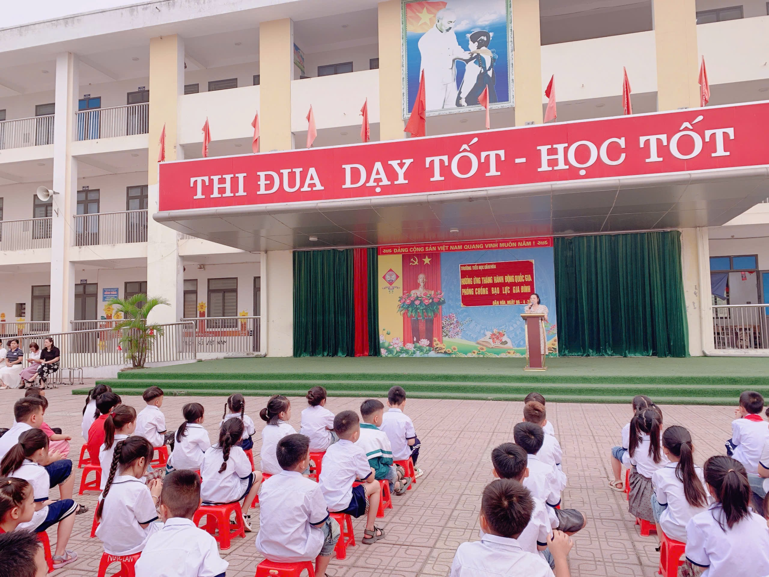 Sáng hôm nay, ngày 06/4/2026, Trường Tiểu học Dân Hòa đã tổ chức buổi tuyên truyền hưởng ứng “Tháng hành động quốc gia phòng, chống bạo lực gia đình” với sự tham gia đầy đủ của cán bộ, giáo viên và các em học sinh toàn trường.